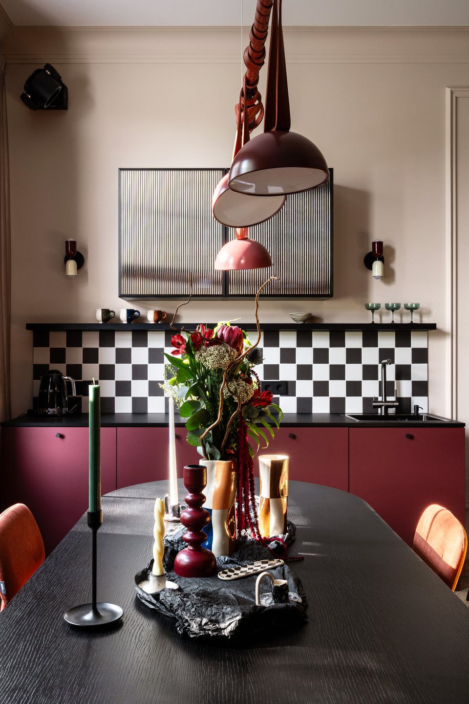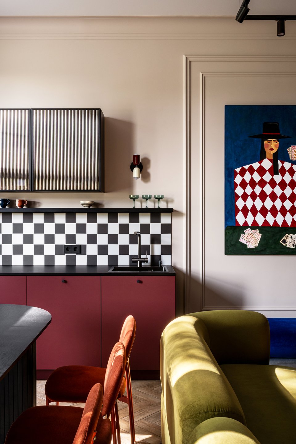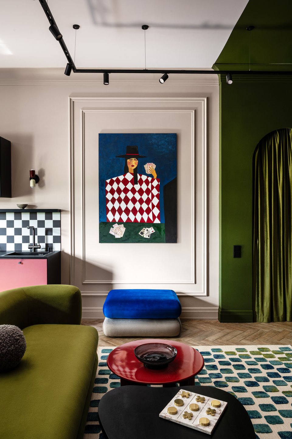 Стену за диваном украсили зеркалом в форме арки, в котором отражается картина, написанная заказчицей. На картине — девушка в блузке с шахматным рисунком с колодой карт. Оттенки, использованные в картине, и шахматная тема объединяют элементы интерьера в общую картину, делают обстановку сложной, многоплановой и динамичной (ковер, фартук в зоне кухни, декор).