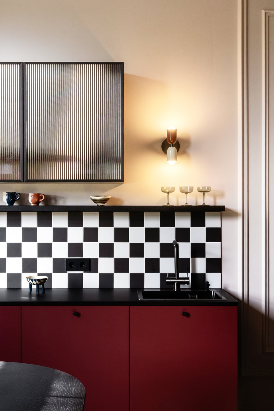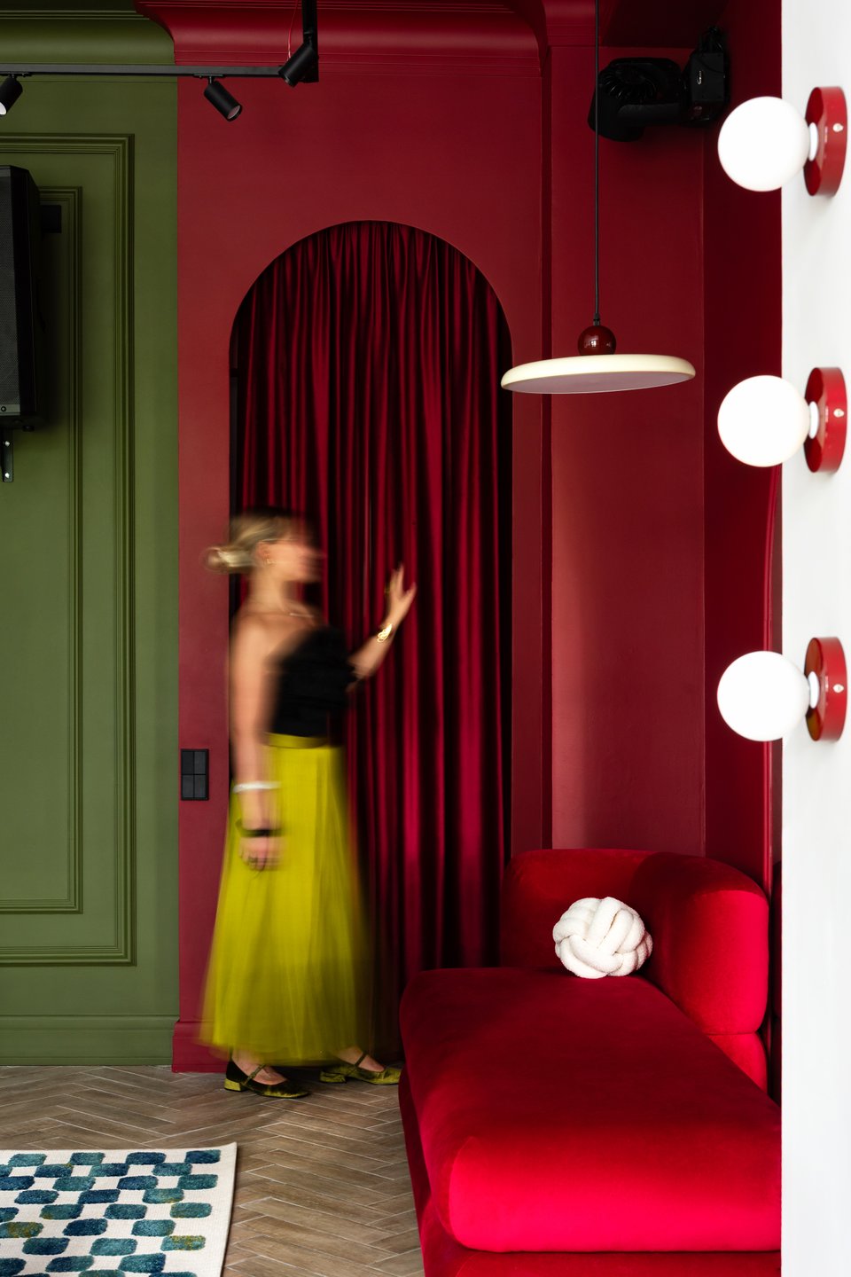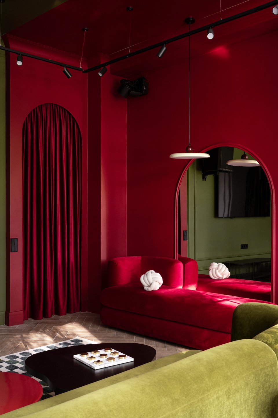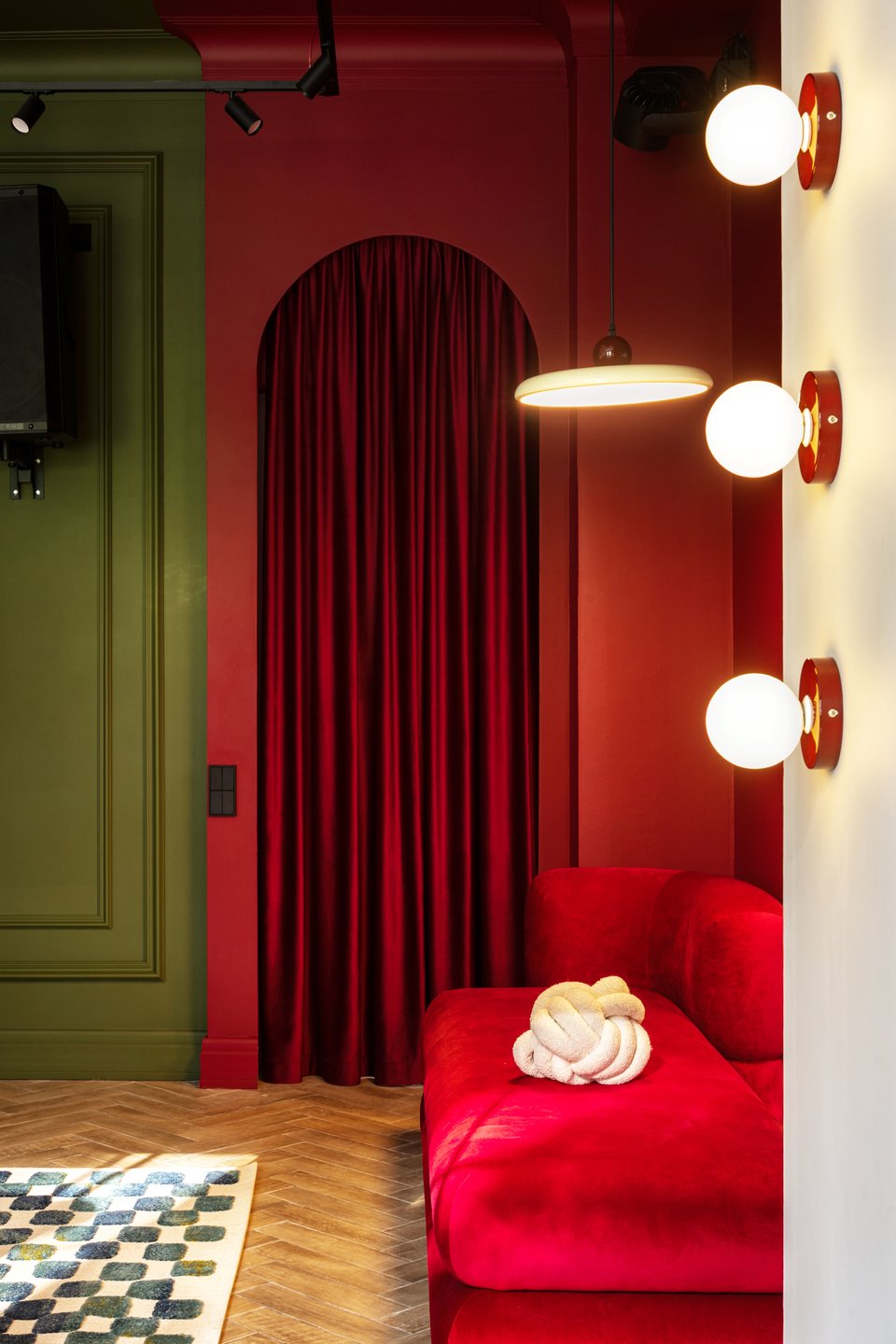 На пол уложили керамогранит под паркет, стены покрыли краской. В качестве основных цветов выбрали насыщенный вишневый и яркий лаймовый. Оттенки «продлили» со стен на потолок, сформировав тем самым уникальную геометрию, которая завораживает и привлекает внимание присутствующих. Игра цвета и текстуры создает камерную атмосферу.