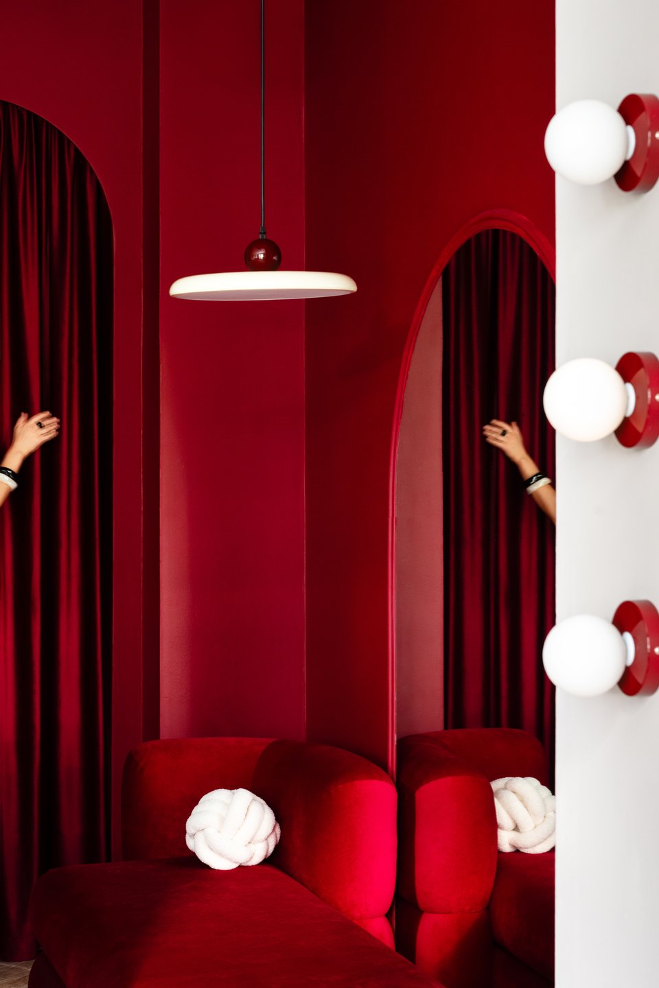 Основной акцент в интерьере — мебель от divan.ru. Футуристичный вишневый диван Brera в зоне отдыха по цвету сливается со стеной, но за счет разницы текстур не теряется на ее фоне. «Это самая популярная селфи-зона у гостей», — комментирует дизайнер.