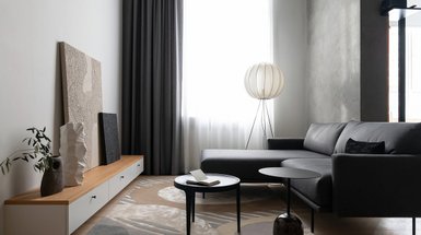 - Гостиная в апартаментах 50 кв.м, ЖК «Поклонная 9». В кадре модульный диван Риббл-2 от divan.ru. Дизайнеры: Евгения Ануфриенко и Юнна Лукинских, студия Yuloo Studio; фотограф: Роман Алексеев