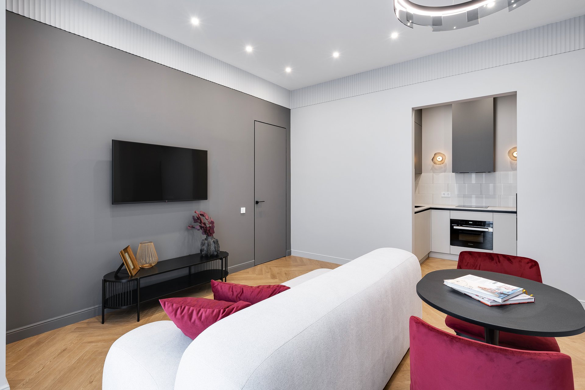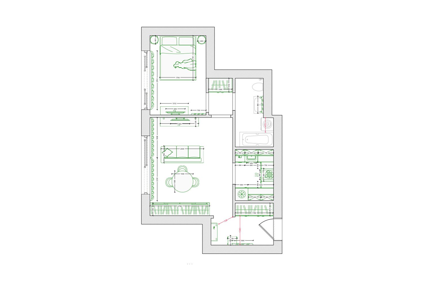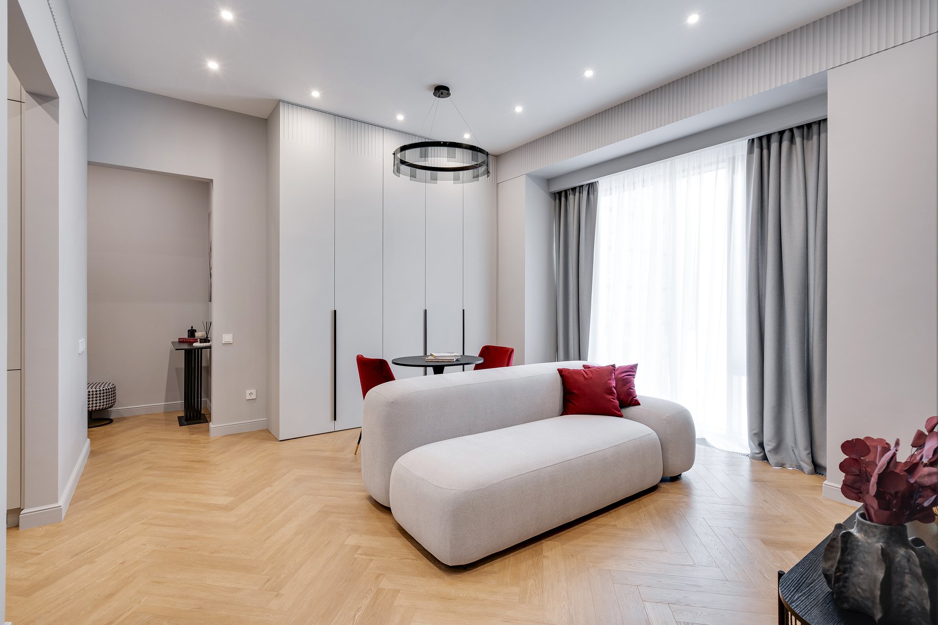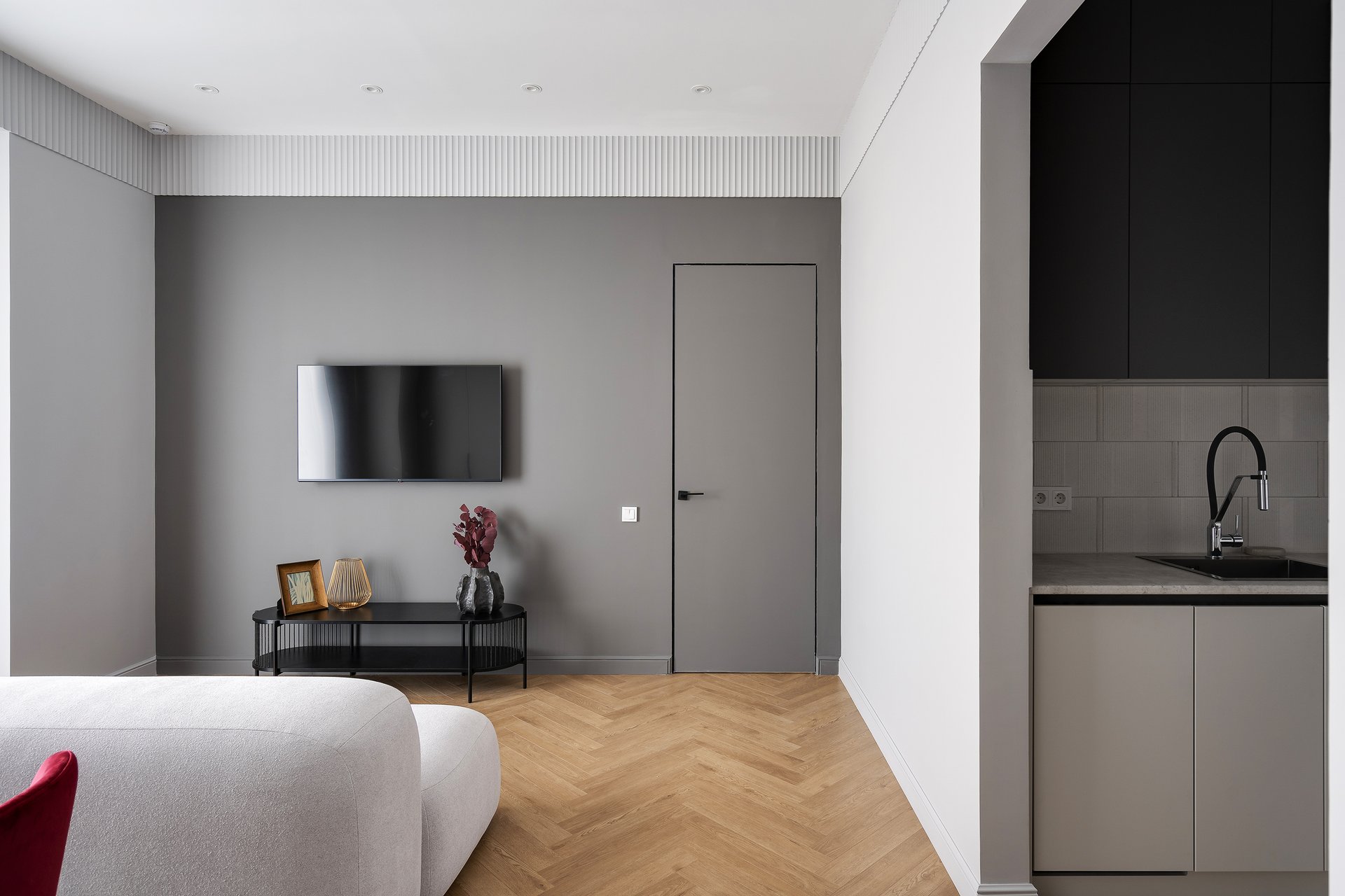 Застройщик сдавал квартиру с отделкой white box. Владелица просила как можно меньше изменений в части уже сделанного ремонта, поэтому от перепланировки отказались. В квартире есть кухня-гостиная, изолированная спальня, совмещенный санузел и отдельная гардеробная.