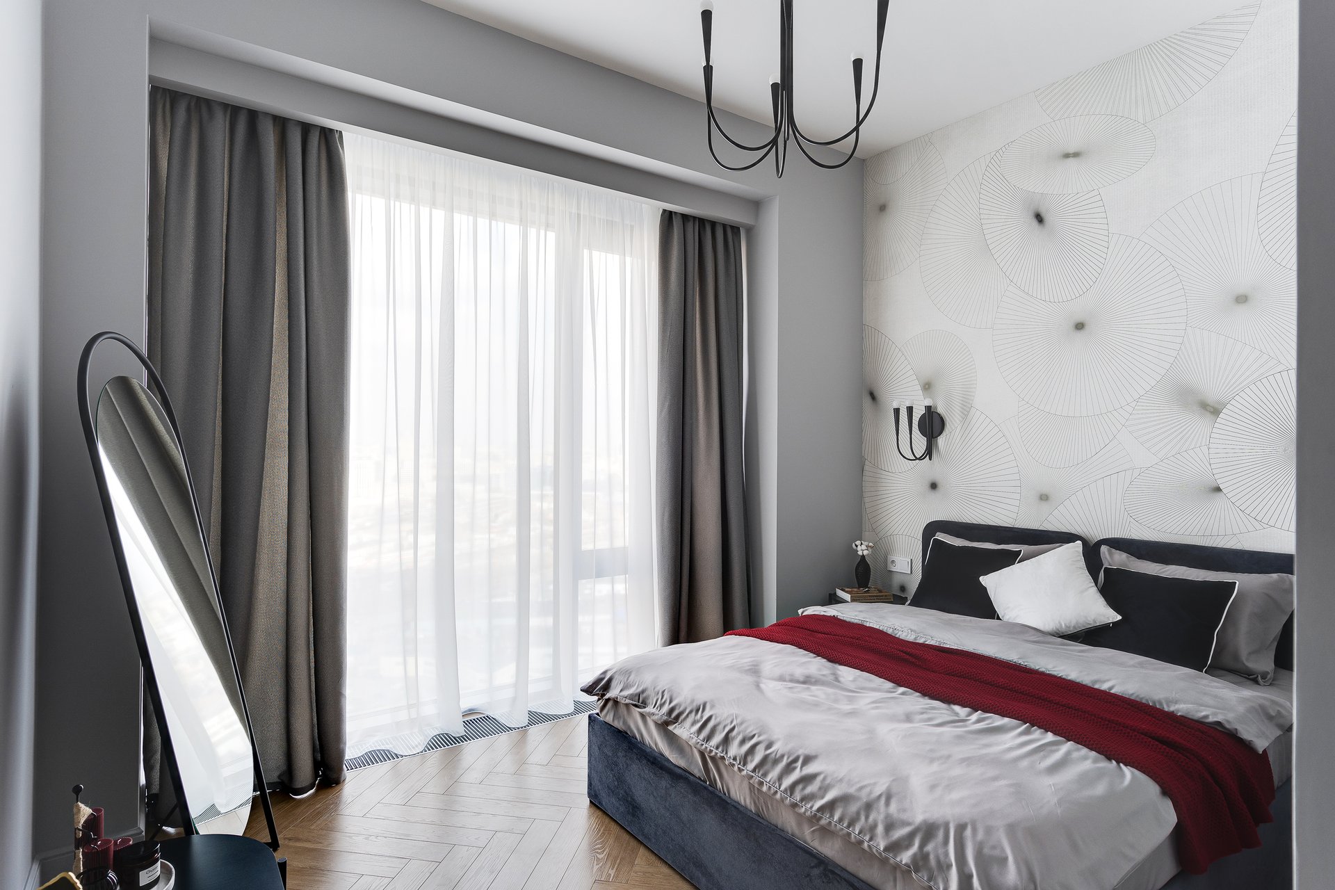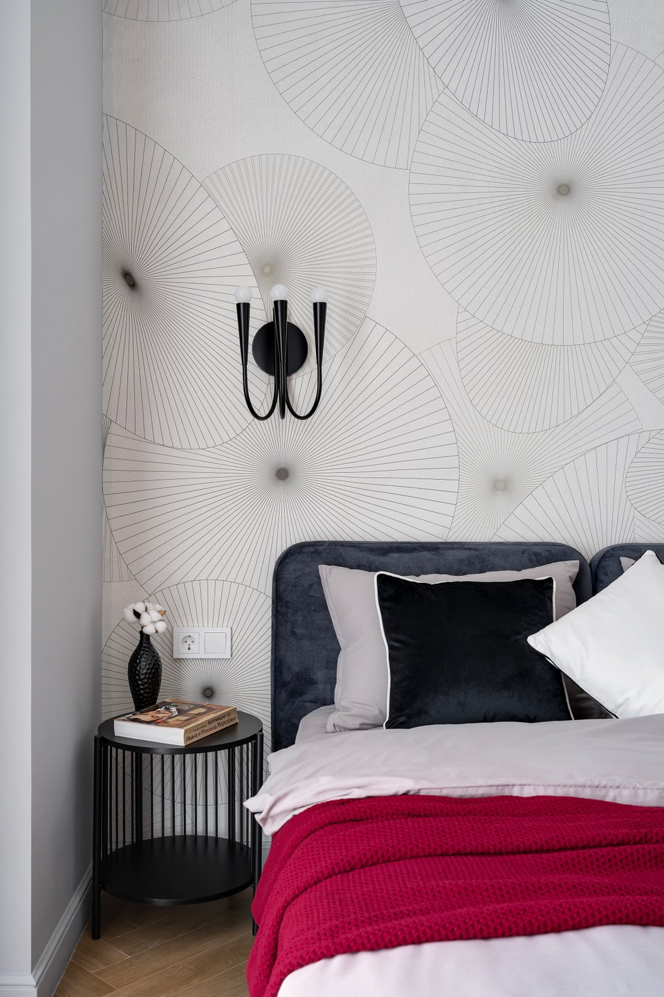 «Главной задачей в небольшой спальне было создать атмосферу уюта и не перегрузить пространство, — рассказывают дизайнеры. — Панорамное окно с красивым видом открывает большой простор для созерцания и наполняет комнату дневным светом. За изголовьем кровати поклеили дизайнерские обои с абстрактным рисунком, напоминающим раскрытые зонты или спицы колеса — динамичный, но не агрессивный узор».