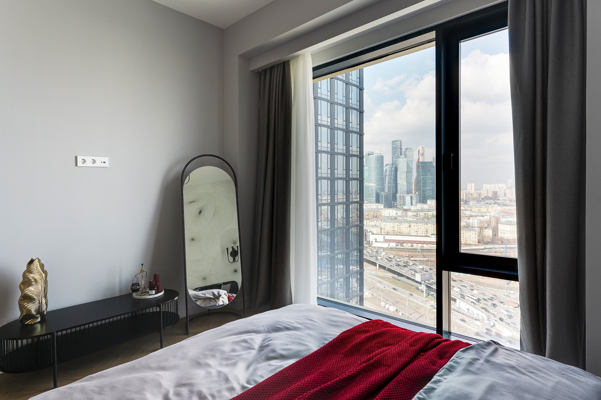 Этот проект был реализован в «невидимом» небоскребе Hide, который своим зеркальным фасадом отражает застройку и небо. Здание буквально «растворяется» в городском ландшафте. Хозяйка квартиры — молодая бизнес-леди, просила сохранить в интерьере «простор» и «воздух», которые транслирует небоскреб. Посмотрим, что получилось.