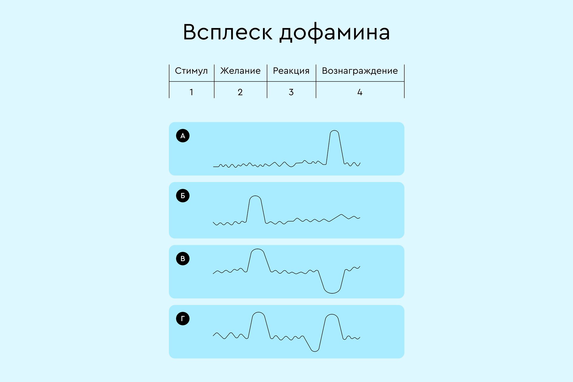 Изначально дофамин вырабатывается после выполнения действия (а). Позже — при формировании желания (б), но только если результат соответствует ожиданиям (в), иначе придется начинать заново. Бывает, что результат отложен во времени, и тогда происходит целых два всплеска дофамина (г). Но так случается нечасто.