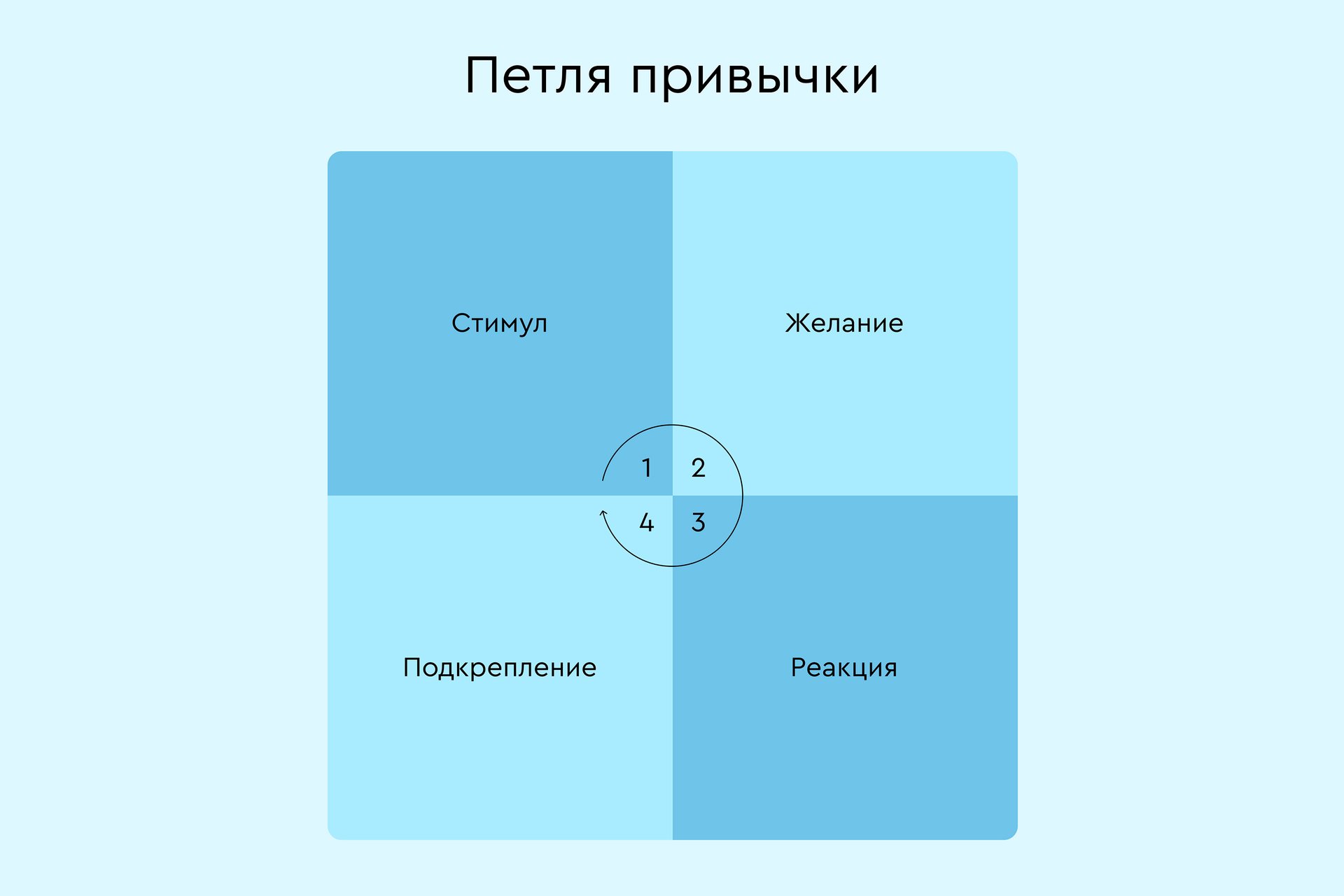 - Привычки формируются в рамках цикла «стимул — желание — реакция — подкрепление». Важно, что на каждую из этих составляющих можно повлиять.