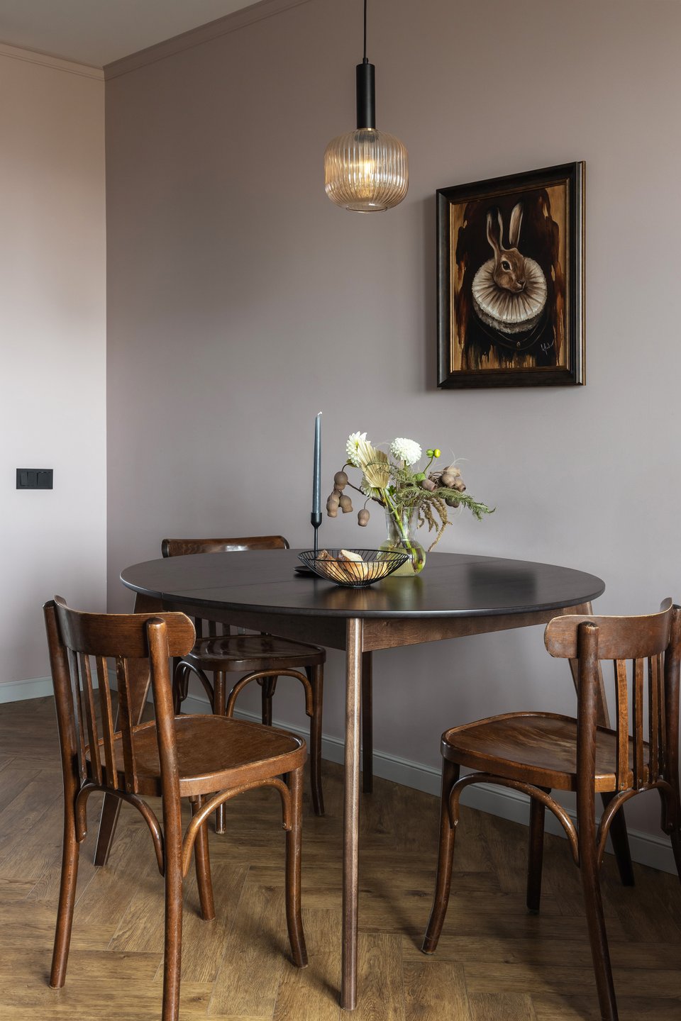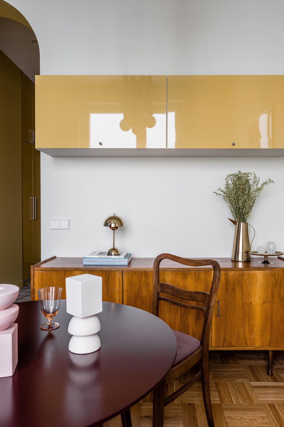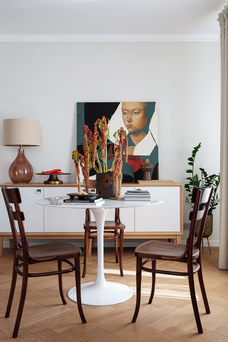 Обратите внимание: в этом интерьере стулья и консоль — винтажные, а стол и модули кухни — современные, но в той же эстетике. На фото: однушка 40 кв.м, ЖК «Петровский парк». Дизайнер: Анна Шевченко; фотограф: Евгений Кулибаба