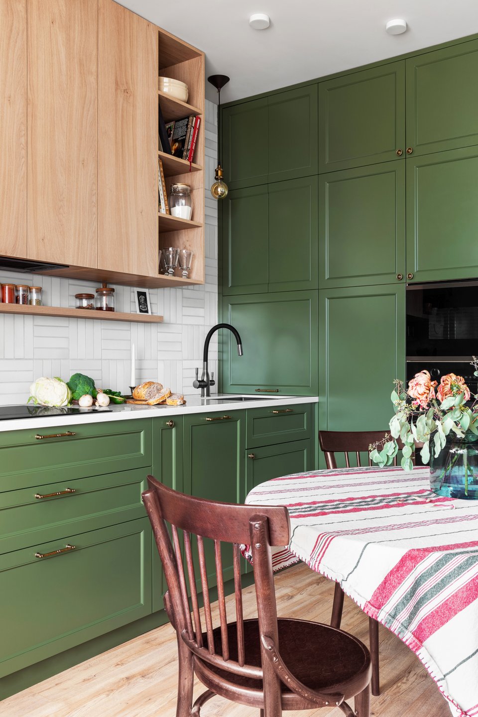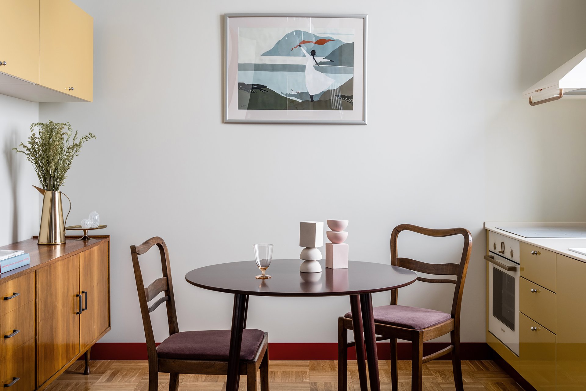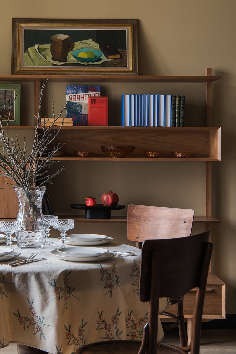 Обратите внимание: в этом интерьере стулья и консоль — винтажные, а стол и модули кухни — современные, но в той же эстетике. На фото: однушка 40 кв.м, ЖК «Петровский парк». Дизайнер: Анна Шевченко; фотограф: Евгений Кулибаба