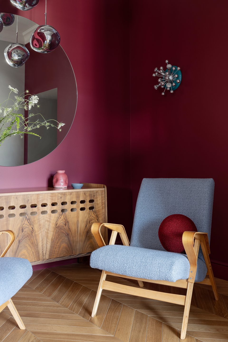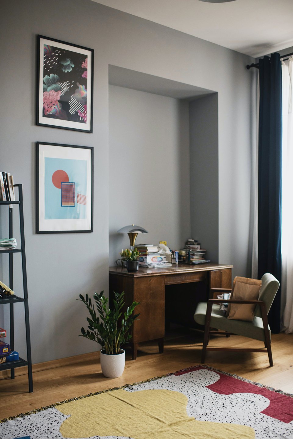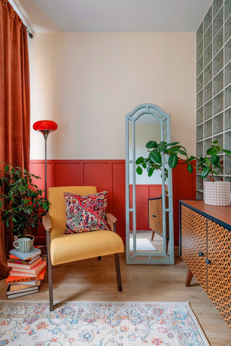 - Продумайте историю: почему эти предметы вместе? Например, винтажная тумба рядом с ретрокреслом в стиле 70-х будет выглядеть гармонично, если подобрать аксессуары, подходящие к обеим вещам: постер, текстиль, вазу, светильник.