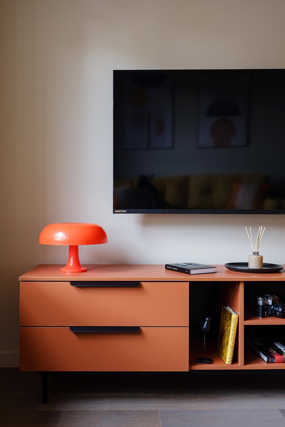 В стиле ретро она будет новой, но выполненной по старым лекалам, с динамичными геометрическими формами, либо стилизованной под них. Например, тумба на высоких расходящихся ножках, как в мидсенчури модерн, часто делается с учетом современных реалий: высоты потолков, ширины ниш и проемов.