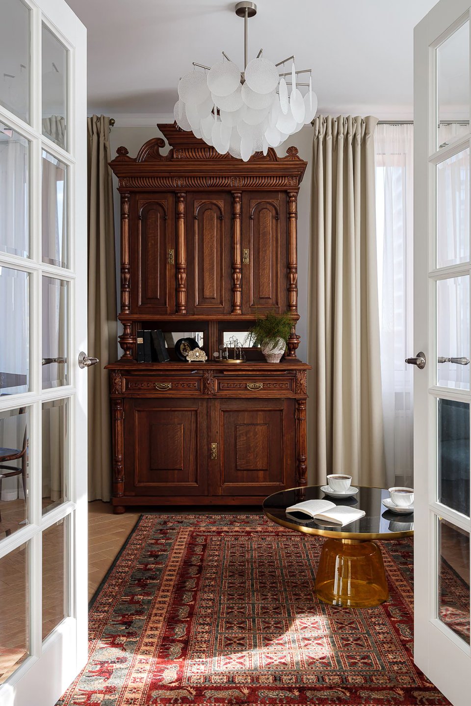 На фото: старинные ковер и тумба в сочетании с современным диваном и креслом Динс Мини от divan.ru в московской трешке 79,2 кв.м. Дизайнер: Лена Харлова; фотограф: Екатерина Гейц