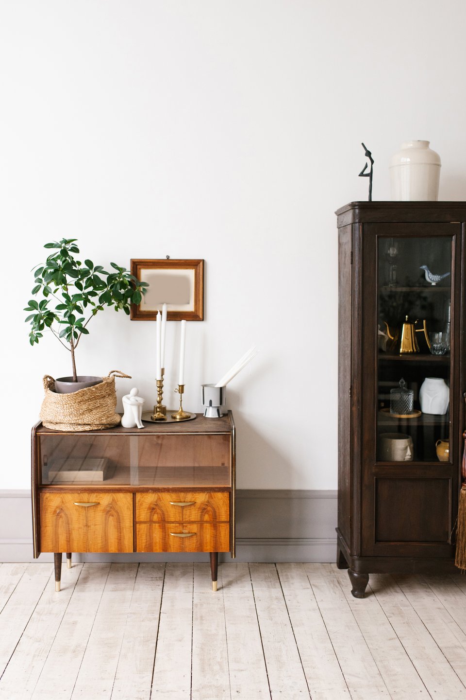 Винтажными обычно бывают вещи, которые касаются истории семьи: картины, фотографии, статуэтки, ковры. С ними интерьер получается очень атмосферным, но требует терпения: нужно выбирать достойные экземпляры, следить за их состоянием и аккуратно вписывать в пространство. Сложную технику, например, граммофон или тостер, необходимо наладить и отреставрировать. Часто под реставрацию попадают также изделия из массива: столики, кресла, стулья, буфеты.
