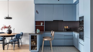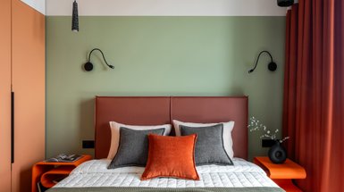 Несмотря на яркость и насыщенность, цвет ройбуш не перегружает интерьер. Напротив, его глубина несет в себе ассоциацию со свежезаваренными листьями одноименного чая, позволяет ощутить привкус на языке и увидеть пар, поднимающийся над кружкой. Чтобы «интерьерный чай не горчил», к акцентным дивану и тумбе стоит добавить несколько «ложек меда» в виде стола, подушки и ковра, а также немного «прохладной воды» в текстиле и кресле, чтобы не «обжечься».