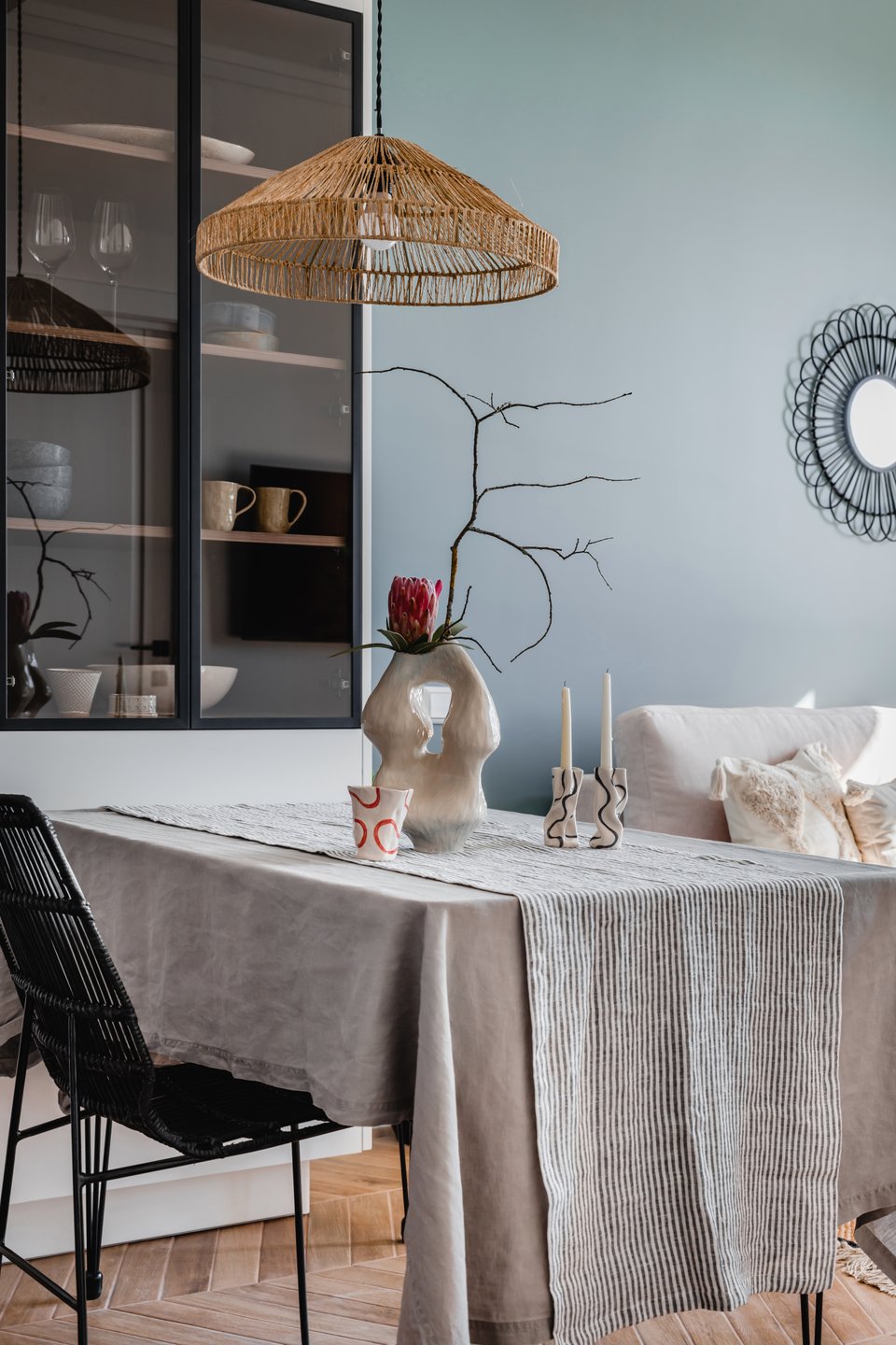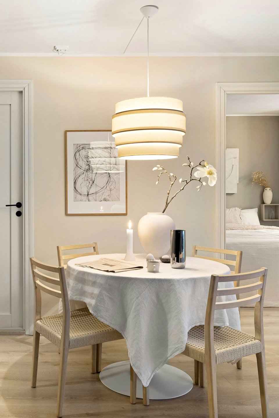 - разместить уютный декор. Пара подушек на стульях, красивая скатерть и несколько пледов сразу преобразят обеденную зону;