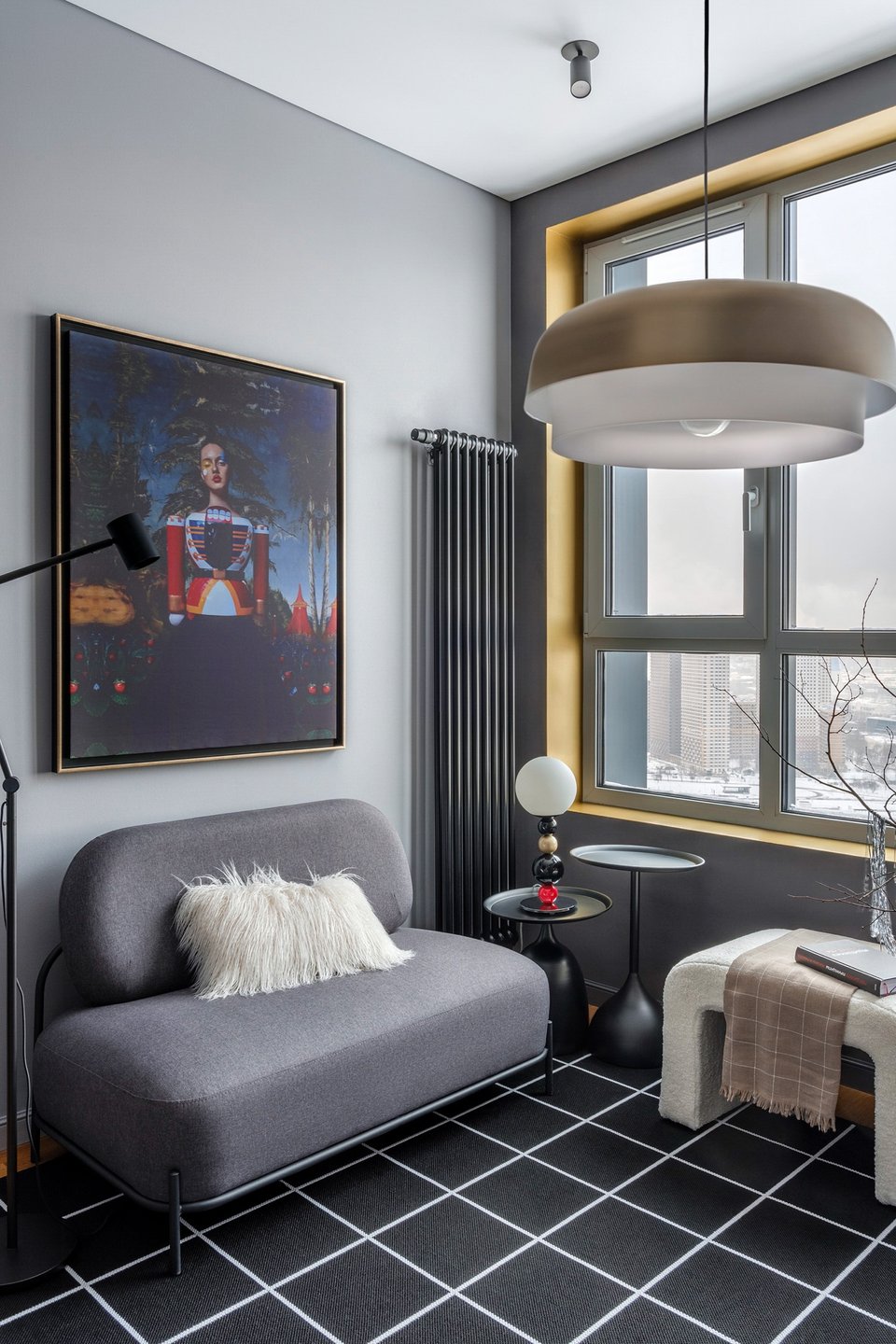 - На фото 3: интерьер квартиры 30 кв.м, ЖК «Огни». В кадре пуф Ринт от divan.ru. Дизайнер: Наталья Калентьева, студия «Территория дизайна»; стилист: Оксана Ипатова; фотограф: Дина Александрова