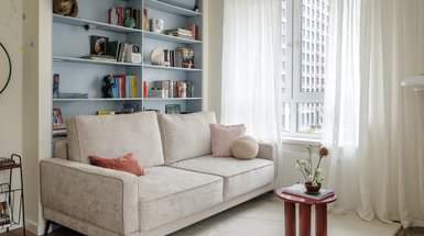 В гостиной у нас 2 разноцветных дивана с набивкой пух-перо — мягкие как облачко. Мы отказались от углового дивана, чтобы не занимать лишние углы. На окнах 60 кв.м тюля — он увеличивает ощущение объема и высоты.
