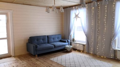 В момент переезда новой мебели еще не было, поэтому взяли самое необходимое из нашей квартиры. Был приобретен лишь диван от Divan.ru и временная кухня, которая состояла из каркасов шкафчиков, купленных в Леруа Мерлен.