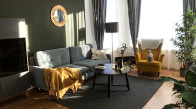 Конечно. Это объединенная кухня-гостиная. Как известно, мебель начинается с дивана. Поэтому в первую очередь в гостиной появился диван, который и стал композиционным центром комнаты. Спасибо Divan.ru — диван выглядел в точности так, как на сайте. Да он и сейчас все такой же красивый, удобный и фотогеничный, несмотря на интенсивную эксплуатацию в режиме 24/7 и две перенесенные химчистки.