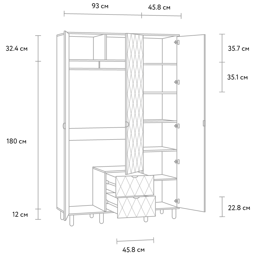 В деталях из натурального массива допускается разница в текстуре древесины. Также возможна разница в цвете, связанная с тем, что древесина по-разному поглощает лаки и краски. Для устойчивости изделия, рекомендуется прикрепить его к стене с помощью мебельного навеса, который присутствует в комплекте. Крепежные средства не прилагаются, для подбора подходящего крепежа рекомендуем обратится в специализированный магазин.