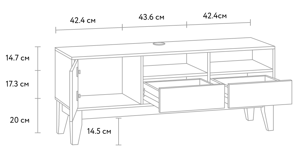 Конструкция модели состоит из закрытой секции, двух ниш и двух выдвижных ящиков, в которых поместятся любые аксессуары и предметы. На крышке-столешнице расположится телевизор, сопутствующая техника или интерьерный декор.