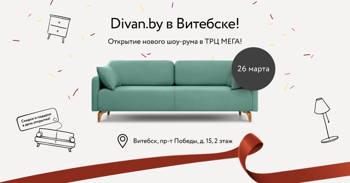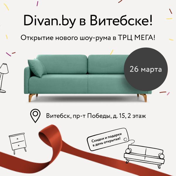 У нас есть прекрасная новость – 26 марта мы приглашаем Вас на открытие нового шоу-рума Divan.by в Витебске! Скидки на все заказы, оформленные в новом шоу-руме 26-27 марта, а также подарки первым покупателям!